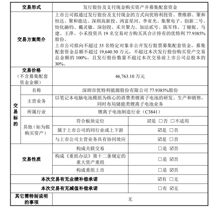 此前于2025年9月,英力股份披露发行股份及支付现金购买资产并募集配套资金报告书草案。根据公告,公司拟通过发行股份及支付现金方式购买吉安市井开区优特利投资有限公司、深圳聚和恒达投资合伙企业(有限合伙)等 19 名交易对方合计持有的深圳市优特利能源股份有限公司 77.9385%股份,同时拟向不超过35 名特定投资者发行股票募集配套资金。此次交易价格为4.68亿元。