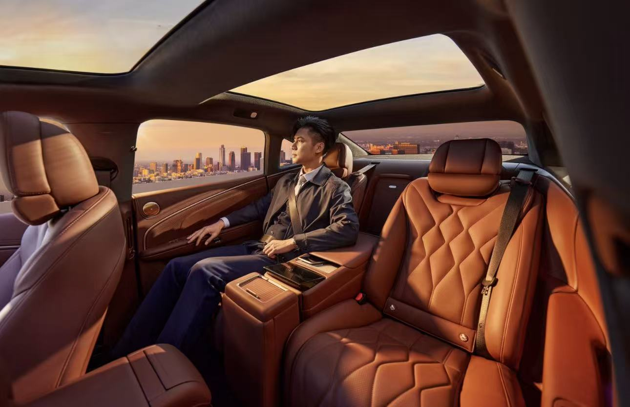 在内饰布局上,昊铂 A800 采用 “前后双环抱” 设计,兼顾驾驶员的操控体验和乘客的乘坐体验。车内配备了史上最长的 6536 毫米月晕氛围灯带,营造出沉浸式的车内空间;内饰材质选用 30 年花曲柳木饰板搭配超柔 Nappa 真皮,融合了东方美学与现代科技感。在配置方面,新车针对商务、家庭等多元使用场景,配备了 2+1 变形座椅(带智慧中岛)、零重力副驾、机械按摩座椅、三温多控智能冰箱、悬浮式双层遮阳帘、23 扬声器旗舰音响等高端配置,让车内驾乘人员的体验更舒适,同时满足不同场景下的使用需求。
