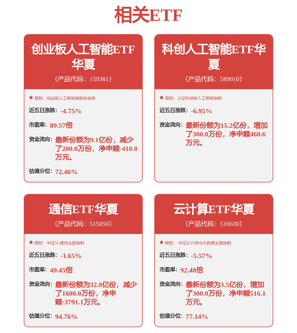 创业板人工智能ETF华夏(159381):跟踪指数的一半权重集中在光模块CPO板块,另一半权重覆盖AI软件应用领域,形成“硬件+应用”的均衡布局。前10大权重股为中际旭创(13.23%)、新易盛(12.67%)、天孚通信(10.18%)、润泽 科技、蓝色光标、协创数据、昆仑万维、北京君正、网宿科技、润和软件。目前基金规模近20亿元,场内综合费率仅0.20%,为同类最低,适合追求高弹性、看好AI+主线的投资者。场外联接(A类:025505;C类:025506)。