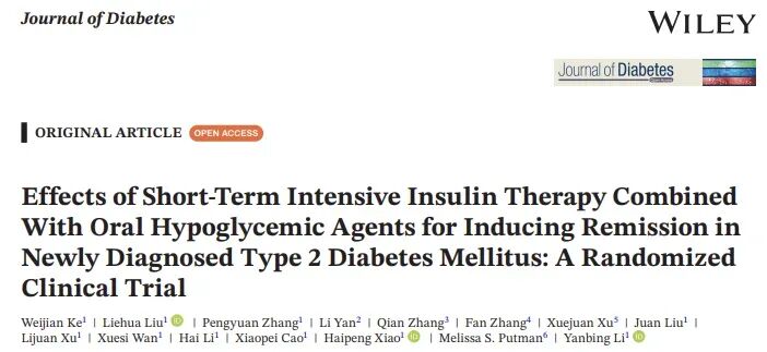 Ke W, Liu L, Zhang P, Yan L, Zhang Q, Zhang F, Xu X, Liu J, Xu L, Wan X, Li H, Cao X, Xiao H, Putman MS, Li Y. Effects of Short-Term Intensive Insulin Therapy Combined With Oral Hypoglycemic Agents for Inducing Remission in Newly Diagnosed Type 2 Diabetes Mellitus: A Randomized Clinical Trial. J Diabetes. 2026 Jan;18(1):e70187.doi: 10.1111/1753-0407.70187. PMID: 41521023; PMCID: PMC12790882.