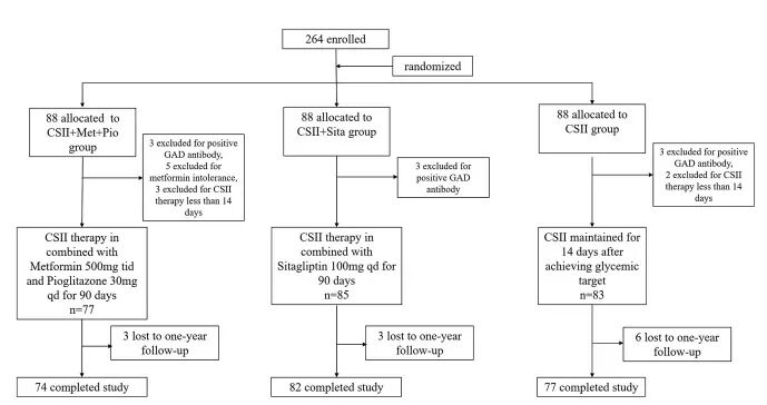 研究采用中心随机化方法,将受试者分配至三组:CSII组(单纯胰岛素泵治疗2周)、CSII+Met+Pio组(胰岛素泵联合二甲双胍500mgtid+吡格列酮30mgqd,持续90天)、CSII+Sita组(胰岛素泵联合西格列汀100mgqd,持续90天)。SIIT采用赖脯胰岛素或门冬胰岛素通过MiniMed712泵输注,初始剂量0.5 IU/kg/日,基础与餐时剂量各占50%。血糖监测极为密集——每日7次毛细血管血糖检测(三餐前后+睡前),根据2010年中国胰岛素泵治疗指南精细调整剂量,目标为空腹血糖<6.1 mmol/L且餐后2小时血糖<8.0 mmol/L。
