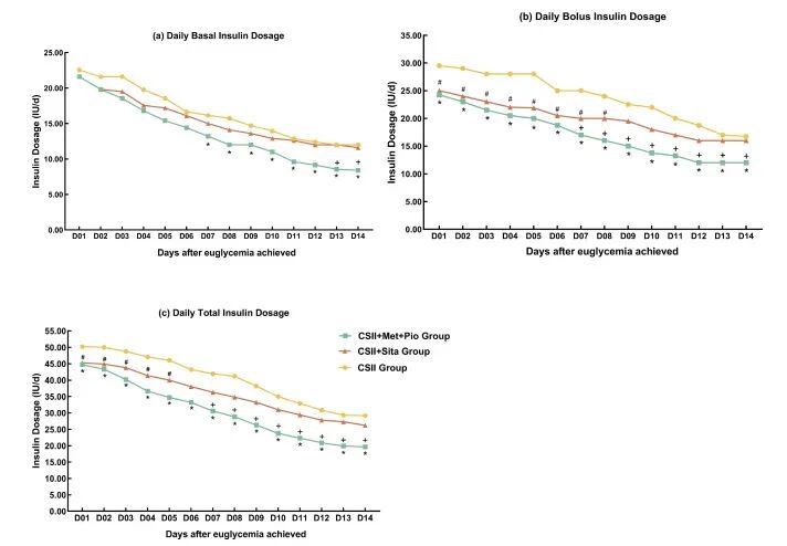 1. SIIT实施阶段的显著优化:联合用药组在胰岛素泵治疗期间表现出明显的实施优势。CSII+Met+Pio组达到血糖目标的中位时间仅为2天,显著短于CSII组的3天(P<0.001);且在治疗达标首日,该组的总胰岛素日剂量(约45 IU/日vs. 50 IU/日)及餐前大剂量均显著低于CSII组(P<0.05)。