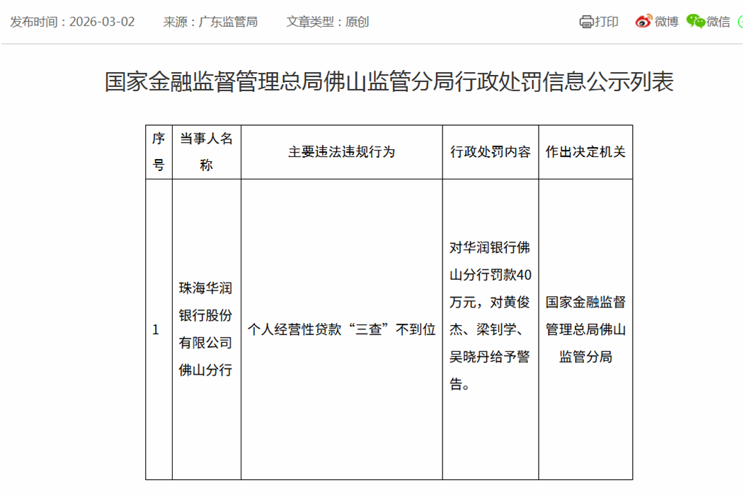 2026年3月2日的40万元罚单,并非华润银行的“偶然失蹄”,而是其近年来合规风险薄弱的一个缩影。梳理国家金融监督管理总局、央行等监管部门的公开处罚信息不难发现,2026年开年至今,华润银行已累计收到2张罚单。2026年1月初,该行及相关分支机构因“关联交易制度不合规、贷款五级分类不准确、实质不良贷款拨备计提不充分”被罚550万元,三名高管被警告并罚款16万元。这两起罚单,分别触及了银行风险管理的核心环节——关联交易管控、资产质量分类、拨备计提,以及信贷业务的基础流程“三查”(贷前调查、贷中审查、贷后检查),凸显了其内控体系的薄弱。