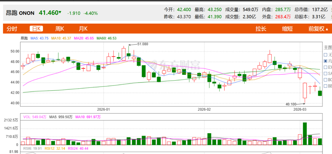 截至3月7日收盘,昂跑股价为41.46美元/股(约合人民币286.74元/股),较3月2日收盘价46.76美元/股(约合人民币323.39元/股),股价下滑11.33%。