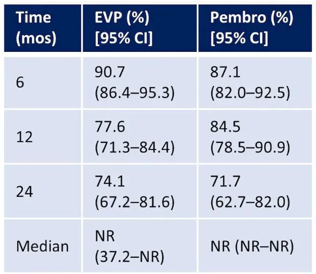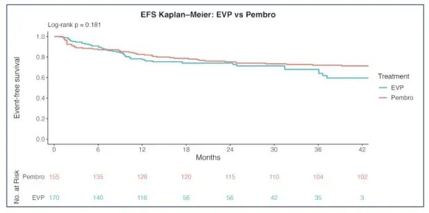然而,当视线转向生存终点时,数据呈现出更为复杂的图景。基于个体患者数据的Cox比例风险模型分析显示,EV联合组相较于帕博利珠单抗单药组的无事件生存风险比为0.75(95%CI: 0.49–1.14),p值为0.181,未能达到预设的统计学显著性阈值。这一结果提示,尽管联合治疗在病理缓解层面表现优异,但这种优势并未稳健地转化为可量化的无事件生存获益。值得注意的是,两组的中位无事件生存期均未达到,表明在现有随访期内多数患者尚未发生事件,数据的成熟度可能不足以检测出真实的生存差异。下图展示了两种治疗方案的Kaplan-Meier无事件生存曲线,两条曲线在早期即呈现分离趋势,EV联合组始终位于上方,但分离程度随时间推移逐渐收窄,反映出长期随访中潜在的风险比变化。