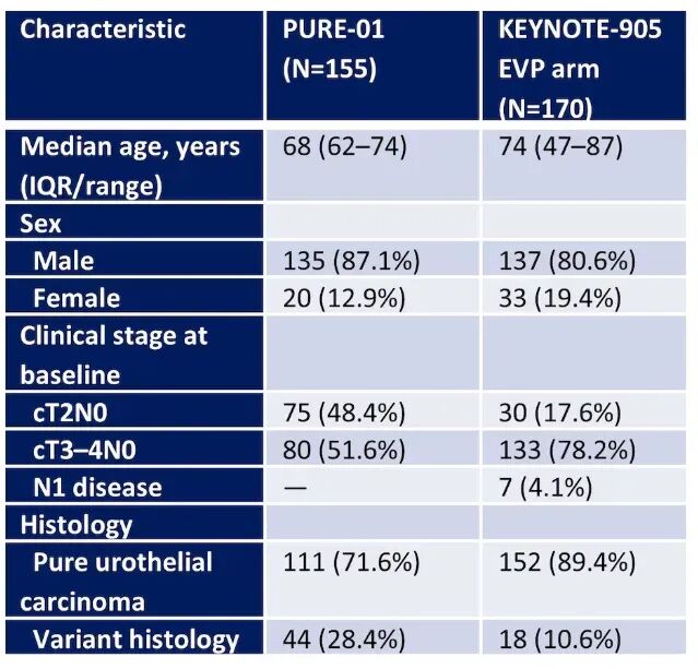 KEYNOTE-905/EV-303采用围手术期策略,患者接受新辅助EV联合帕博利珠单抗治疗后行根治性膀胱切除术,术后继续接受6周期辅助EV联合帕博利珠单抗,随后再接受6周期帕博利珠单抗单药维持治疗;而PURE-01仅实施新辅助帕博利珠单抗单药治疗,术后无系统性辅助治疗。这种设计差异意味着两组患者在治疗强度、治疗时长及药物暴露量方面均不可比,给疗效归因带来了根本性困难。