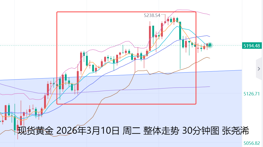 上交易日周二(3月10日):特朗普声称中东战争“很快就会结束”,但美国和以色列仍对伊朗进行了猛烈的空袭,市场正权衡特朗普对伊朗的矛盾信息,美元指数陷入震荡,但仍受到支撑买盘和通胀担忧缓解的提振,国际黄金维持多头动力,偏震荡收涨,收于中轨及短期均线上方,多头动力加强,也暗示短期有再度走强向上攀升,触及布林带上轨5340目标的预期。下方则关注5日或中轨线等支撑进行看涨入场。