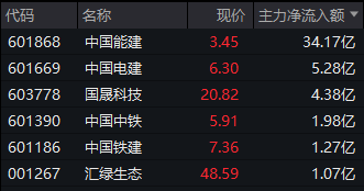 个股方面,中国能建获得逾34亿元主力资金净流入,中国电建、国晟科技、中国中铁、中国铁建等也获得超亿元净流入。