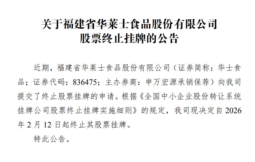 2026年2月12日,华士食品发布公告,宣布正式终止在新三板挂牌,摘牌理由被归纳为“配合公司长期发展战略规划、提升运营效率、降低成本”。
