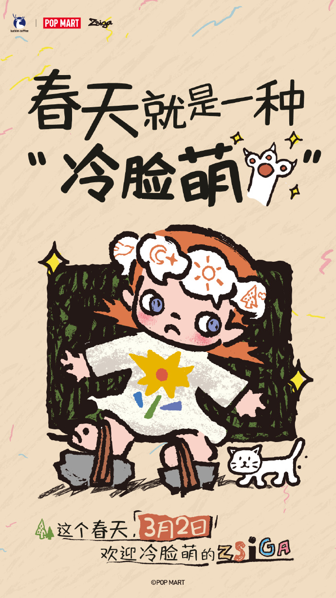 iBrandi品创注意到,3月2日,泡泡玛特官宣与瑞幸开启联名合作。这一次联名的对象不是labubu、星星人这种具有头部号召力的大爆IP,而是选了嘎子姐,一个泡泡玛特的中腰部IP——zsiga。此次合作也推出了杯套、纸袋、贴纸、徽章以及城市限定帆布袋等多种周边产品,并在多个城市同步展开。