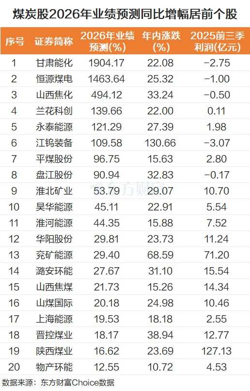 个股而言,机构对于煤炭股2026年的业绩预测也普遍乐观。甘肃能化和恒源煤电机构预测2026年业绩同比增幅将超过10倍,山西焦化、兰花科创、永泰能源、江钨装备2026年业绩预计同比翻倍。