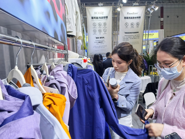 在绿色可持续发展领域,嘉耀纺织的实践同样彰显专业素养。本次展会中,企业重点展示了其在环保领域的举措:扩大生物基材料、可降解材料、碳捕捉材料等零碳和负碳材料的应用;采用原液着色、无水染色、低温染色等技术,缩短工艺流程、降低染色能耗;全面推进无氟防水整理,并引进最先进的安捷伦6475氟化物检测设备进行严格管控,完美契合本次展会可持续创新专区的理念,也呼应了全球纺织行业“双碳”目标与绿色消费趋势,成为众多注重环保的采购商的优选合作对象。
