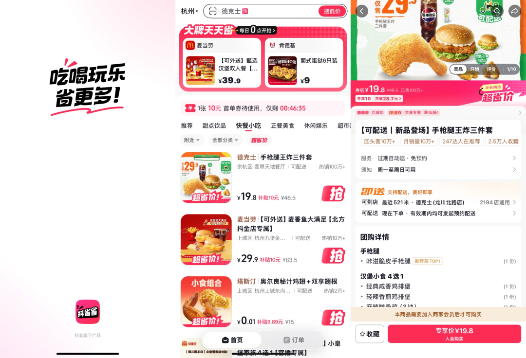 另一方面,就在“随心团”更名的前一个月,抖音还上线了一款独立团购App——“抖省省”。这款产品主打线下到店消费场景,用户可以直接用抖音账号登录,原账号内的团购订单、收藏商家等信息都能一键同步。