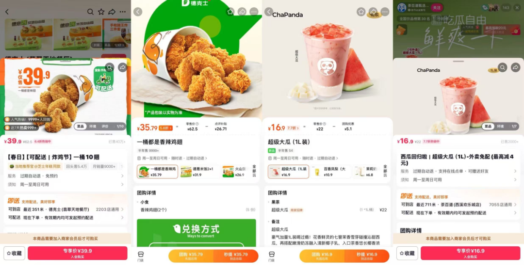 目前,可支持配送的多为德克士、喜姐炸串等连锁品牌。对比大众点评价格来看,抖音即送并没有更多优惠。例如茶百道的超级大瓜桶,双平台价格都是16.9元。德克士的十翅桶大众点评到手价35.79元,抖音即送是39.9元。