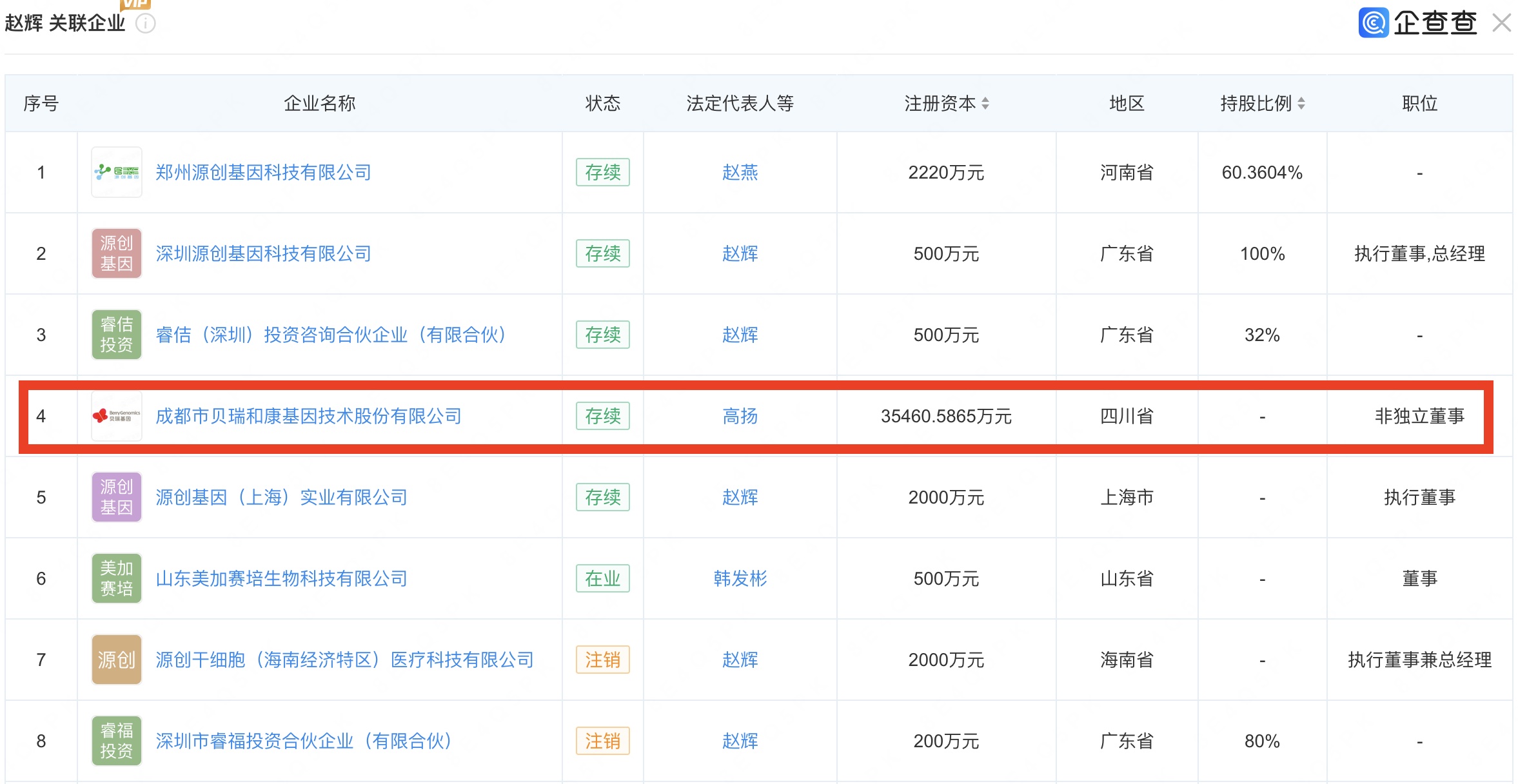 值得关注的是,此次被点名的源创基因,在企业信息层面有着超出一般医美供应商的复杂性。企查查数据显示,源创基因第一大股东赵辉直接持股约60.36%,并通过睿佶(深圳)投资咨询合伙企业(有限合伙)间接持有22.52%,合计掌控公司82.88%股权。而赵辉本人作为贝瑞基因董事会成员的身份,使得这一事件从单纯的医美行业监管问题,延伸出了关于信息披露与关联风险的更多追问。