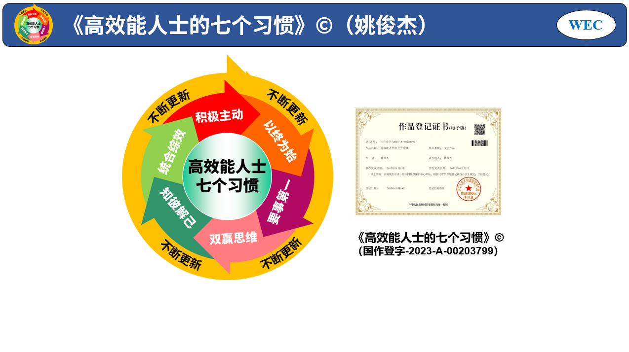《高效能人士的七个习惯》(国作登字-2023-A-00203799)是姚俊杰老师的版权课程。姚俊杰老师多年来为众多国内知名企业的管理者进行了《高效能人士的七个习惯》的培训。培训中,姚俊杰老师采用方法论和行为学习法,结合成人学习原则,融入企业的行业现状及学员的工作实际,引入多重现代AI工具和训练方法,使学员精准把握每个习惯的核心,快速掌握建立每个习惯的要领,并为每个习惯线下训练设计了科学的方法和任务,便于企业领导及培训部门追踪学员七个习惯的训练情况,巩固卓越习惯建立成果。