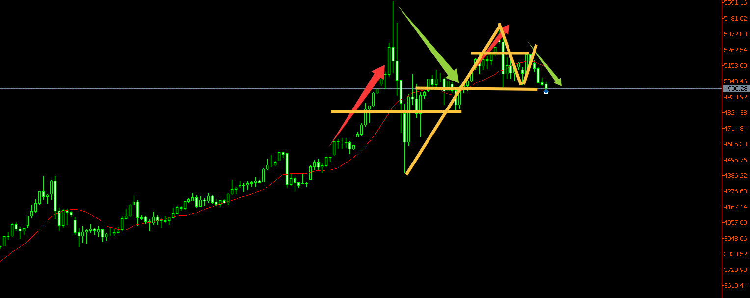 黄金一到晚盘就开始走弱势震荡,我们发现每次亚盘探底后它必须会有一波回调,所以今天金价回调到5015附近.我们果断的布局了一波低多,收割价在5035附近的,最高金价上行至5035.9,所以有的时候操作,必须要求得快进快出,行情那么大,亚盘我们只看反弹,而欧美盘可以大胆去做空操作,现在黄金5000美元大关已失守,变成了压力线,从4小时图来看的话,5000美元/盎司,偏幅五美金左右,都可以放空操作。晚盘不要做多了,高空布局为主。