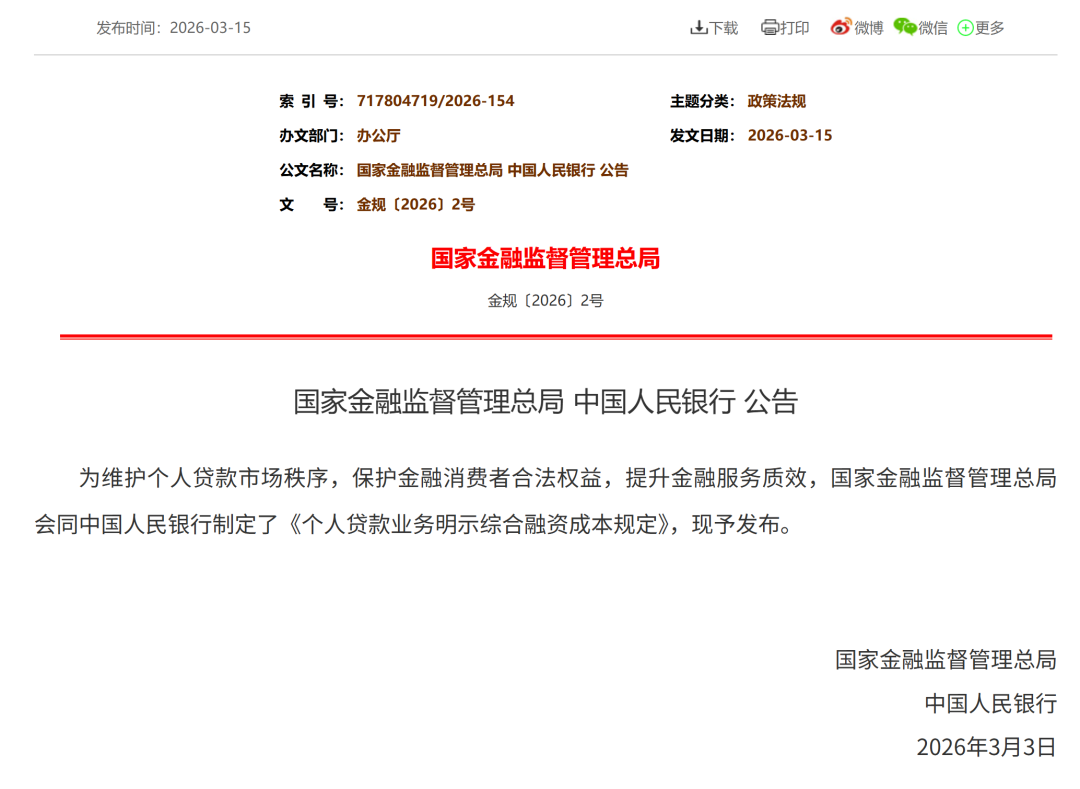 3月15日晚间,国家金融监督管理总局、中国人民银行发布《个人贷款业务明示综合融资成本规定》(以下简称《规定》),明确自2026年8月1日起,要求所有贷款人向借款人展示综合融资成本明示表,清晰披露各项个人贷款息费成本,推动个人贷款各项息费“阳光化”“透明化”。