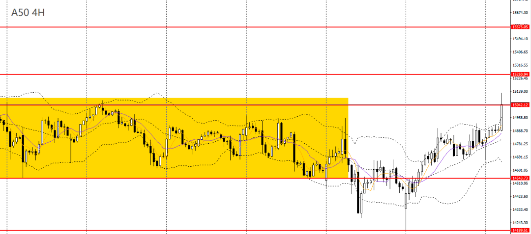 A50周一延续上行,日线RSI站上50,4小时刺破15000关口压力,打破此前区间震荡格局,多单可继续持有,如有效升破15000,可上看至15200。