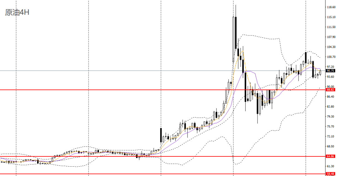 美原油昨日收看跌吞没阴柱,回踩5日均线,4小时下探91-92支撑带企稳,如维稳于上方,短线可继续择机做多,上方继续密切关注102-104压力带,如再度承压,多单建议离场。