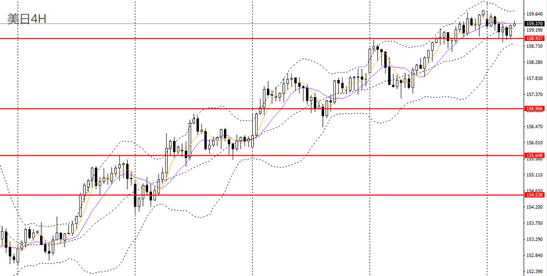 美日周一小幅下挫,徘徊于5日均线附近,日线RSI仍位于高位,4小时继续站稳159关口,但160仍为上方强压,如无法有效升破,多单可考虑减仓,如上破压力,可看多至160.20。