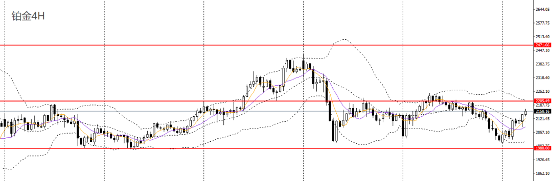 铂金大幅反弹,2000仍为下方关键支撑,4小时反弹强劲,预计将再度上探2200附近,如无法升破,多单可离场。