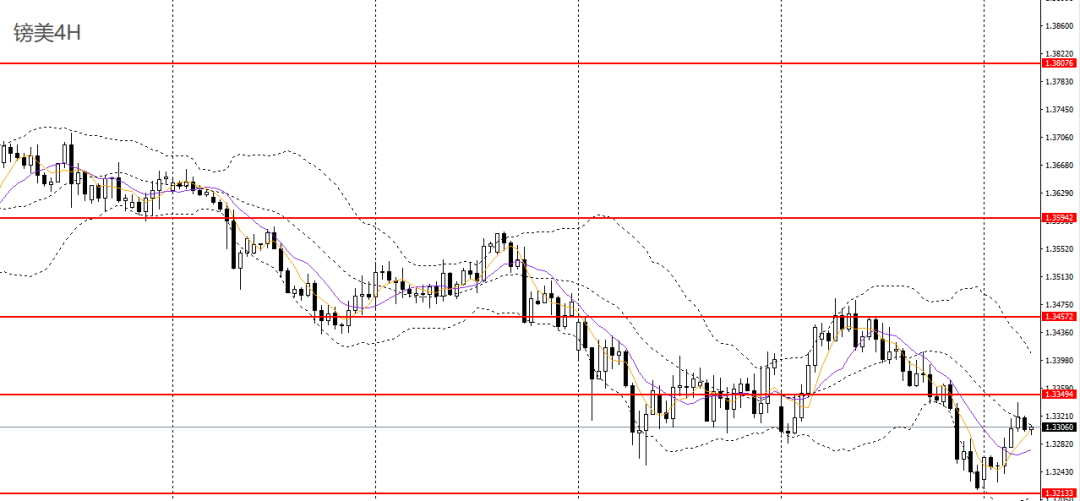 镑美周一强势反弹,4小时守住1.32关口支撑,空头动能减弱,1.3350附近仍面临强压,如继续承压于下方,多单建议离场。