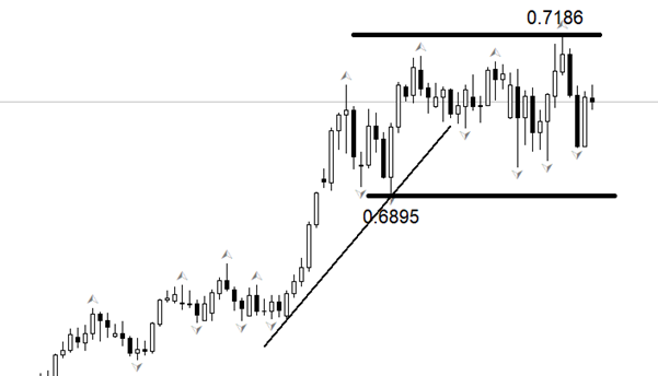 行情方面,2月份以来,AUDUSD处于横盘震荡状态,上限0.7186,下限0.6895点,目前没有迹象表明震荡状态即将结束。澳洲联储加息利多澳元,但利多效应在行情中表现的不够明显,截至目前日K线呈现小十字星形态。