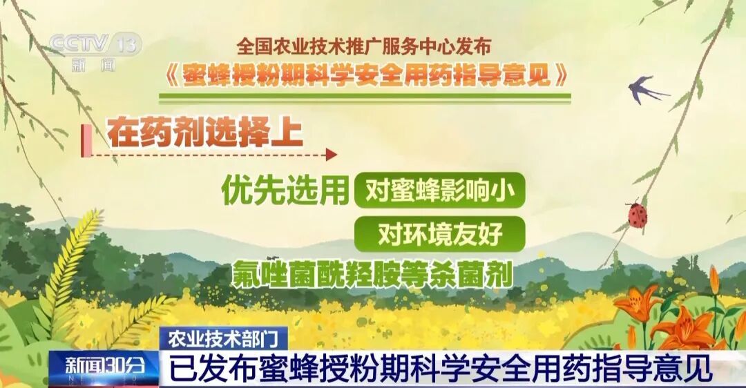 在生产实践中,种植户都会主动保护蜜蜂。针对近年来花期用药越来越普遍的情况,各地会指导农户选择适宜药剂、适宜时间作业,尽量减少对蜜蜂的影响。今年2月,全国农业技术推广服务中心发布《蜜蜂授粉期科学安全用药指导意见》,提出四项具体措施——