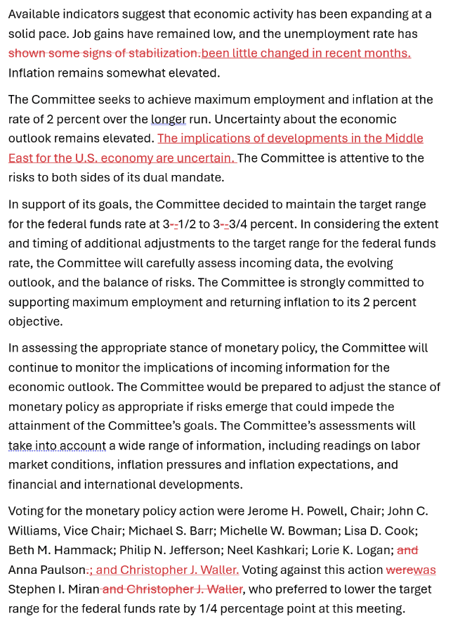 其次,本次声明首次明确提及中东局势,指出“中东局势发展对美国经济的影响仍存在不确定性”,意味着地缘冲突及其对油价、通胀和经济前景的潜在冲击,已正式进入美联储的政策考量框架。