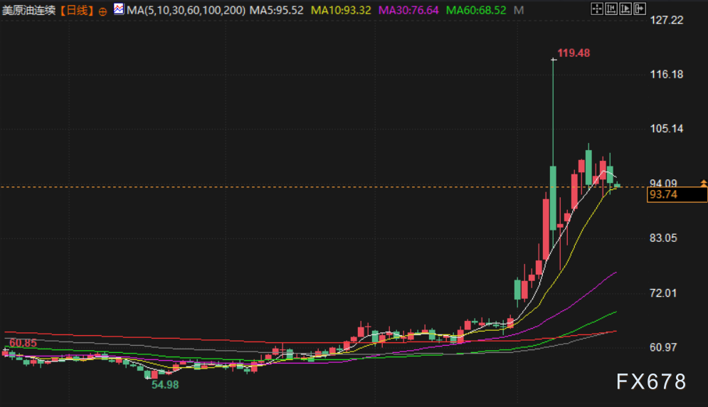汇通财经APP讯——周五(北京时间3月20日)亚市早盘,现货黄金交投于4641美元/盎司附近,金价周四下跌超3%,一度逼近4500美元/盎司关口,创2月初以来最低水平,因市场预期主要央行将维持利率在高位,尽管中东冲突推高了能源价格并引发通胀担忧;美原油交投于93.83美元/桶附近,油价周四回落,美油回落超4%,美国政府采取措施试图平抑油价涨势,包括考虑解除对部分伊朗原油的制裁以及可能再次释放战略石油储备。