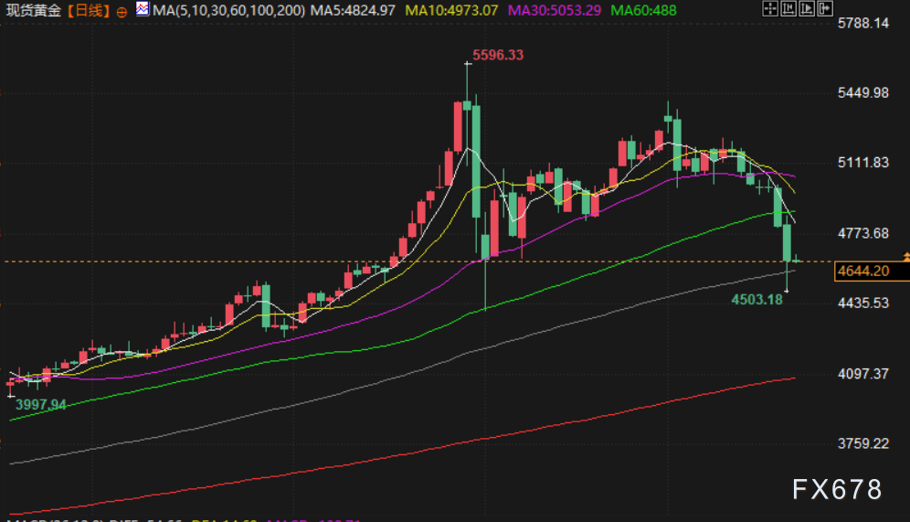 金价周四连续第七个交易日走低,现货黄金周四下跌超3%,一度逼近4500美元/盎司关口,创2月初以来最低水平,因市场预期主要央行将维持利率在高位,尽管中东冲突推高了能源价格并引发通胀担忧。