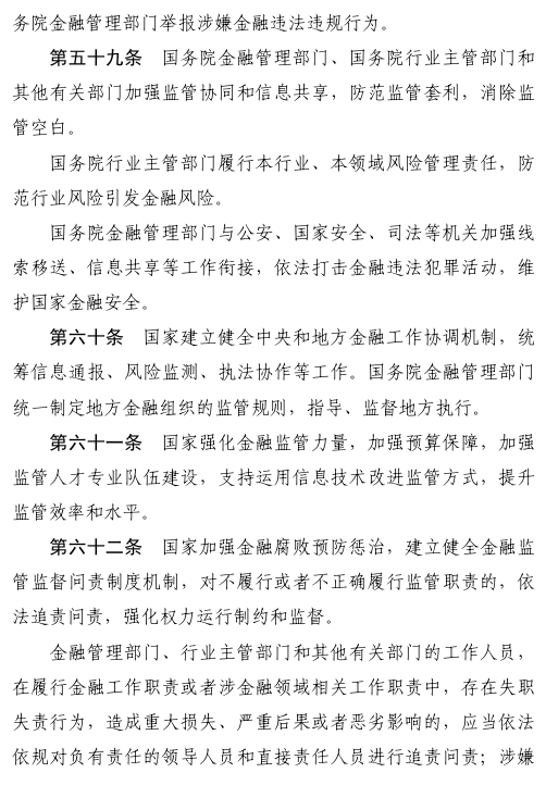 六是全面加强金融监管。明确金融各领域监管职责和央地监管分工,并建立兜底监管机制,实现监管全覆盖。完善金融消费者、投资者权益保护体制机制。同时,对监管协同、履职保障和追责问责提出明确要求。