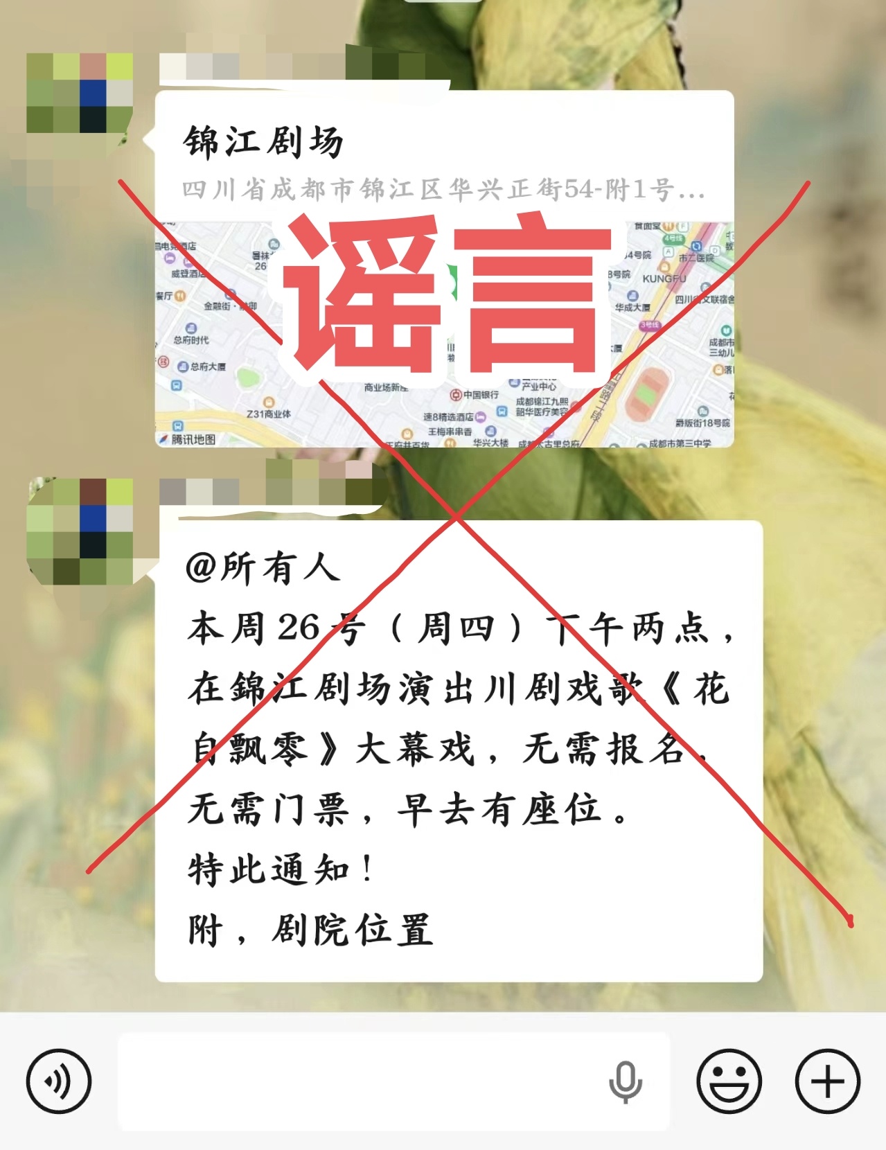 近期,部分微信群及网络平台流传上述剧目“惠民演出、免票入场”等不实信息。成都市川剧研究院表示,上述内部合成、审查及录像环节均未对公众开放,也未向社会征集或组织观演。凡传播“免票入场”“随便进场”等信息均属谣言,为保障工作秩序及安全,成都市川剧研究院提示戏迷请勿自行到场“探班”。