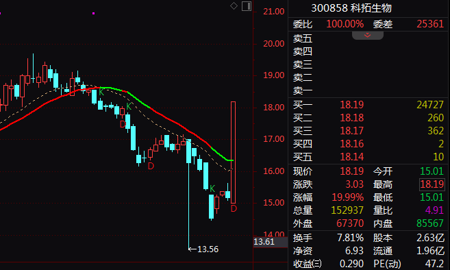 医药板块走强,科拓生物20cm涨停,美诺华6天5板,万邦德4天3板,双鹭药业3天2板。