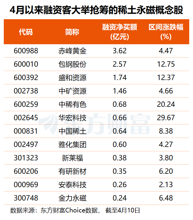 结合资金来看,东方财富Choice数据显示,本月共有25只稀土永磁概念股获得融资净买入,其中,赤峰黄金、包钢股份分别获杠杆资金加仓3.62亿和2.57亿元,盛和资源、中矿资源均获融资客超1亿元抢筹,中稀有色、华宏科技、中国稀土等4股融资净买额均在6000万元以上。