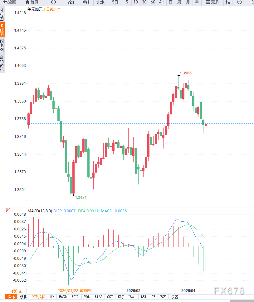 从技术面来看,日线级别上,美元/加元自高位回落后进入震荡区间,整体结构由上升趋势转为整理格局。当前价格在1.3800附近遇阻,该位置构成短期关键阻力,而下方1.3700区域形成阶段性支撑。若无法有效突破1.38,则反弹更可能属于修正行情。