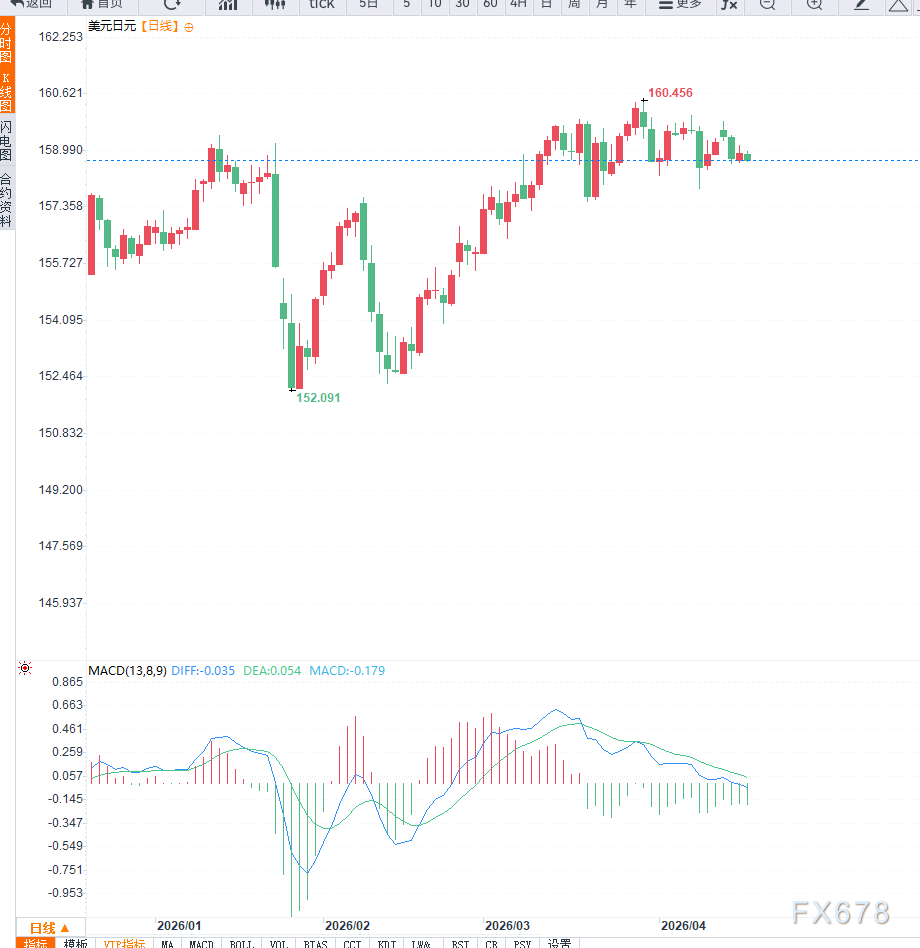 从技术面来看,日线级别上,美元兑日元在高位回落后进入震荡整理阶段,整体趋势由此前单边上行转为区间运行。当前上方关键阻力位位于160.80附近,该区域为前期高点密集区;下方重要支撑位位于156.50一线,为近期回调低点区域。RSI指标回落至中性区间,显示多头动能明显减弱。