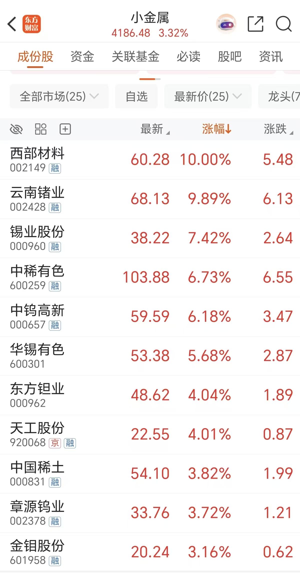 周一稀土小金属概念走强,截至午间收盘,西部材料涨停,云南锗业涨超9%,锡业股份、中稀有色、中国稀土等跟涨。