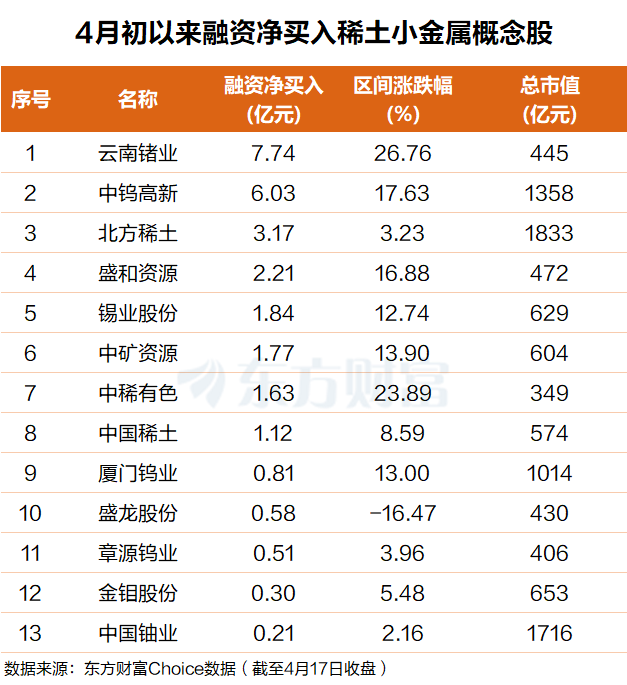 北方稀土、盛和资源、锡业股份、中矿资源、中稀有色、中国稀土等个股融资净买额在3.2亿元至1亿元之间不等。