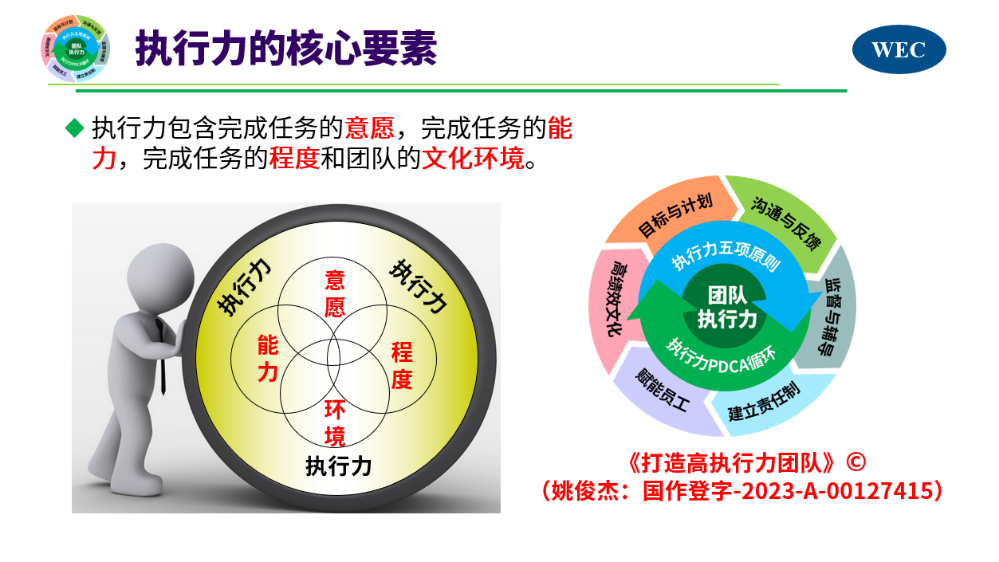 管理专家姚俊杰老师在其版权课程《六步打造高绩效执行力团队》(国作登字-2023-A-00127415)中,除了解析人的不同思维模式对执行力的影响,在解析“执行力”的底层逻辑时,明确提出了影响执行力的这四个维度:
