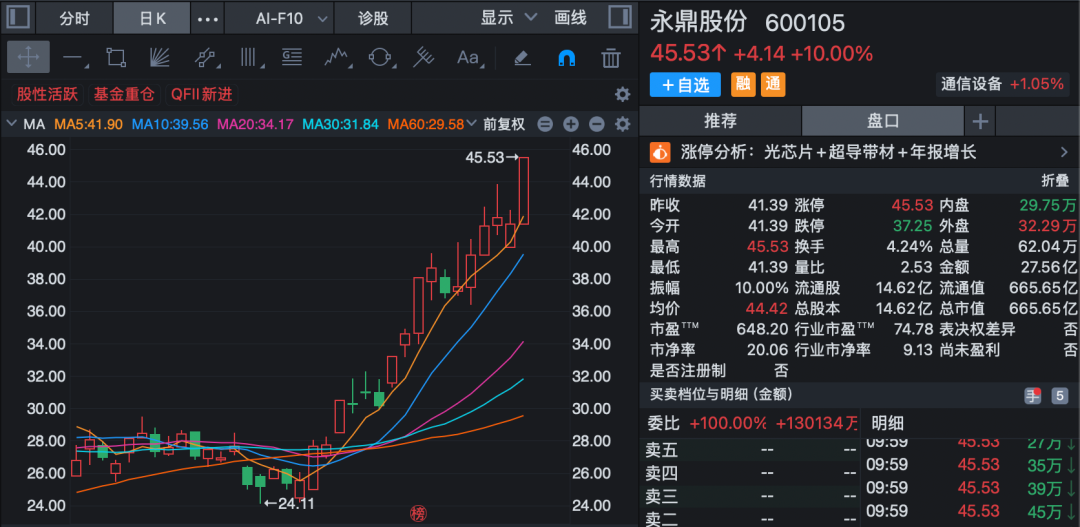 光纤概念再度活跃,永鼎股份涨停,续创历史新高,中天科技、亨通光电、长飞光纤、通鼎互联等跟涨。
