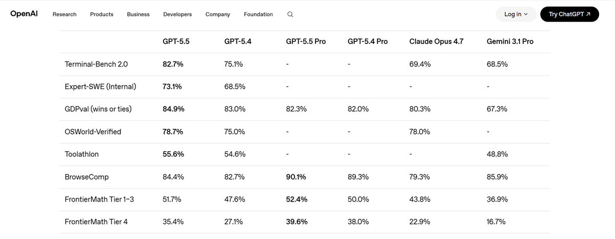 此外,OpenAI表示,GPT-5.5在提升智能水平的同时并未牺牲速度,它完成相同的Codex任务所需的Token数量显著减少,使其效率更高,功能更强大。OpenAI还展示了和Claude Opus 4.7、Gemini 3.1 Pro等的对比数据,并表示已经全面超越其他模型对手。