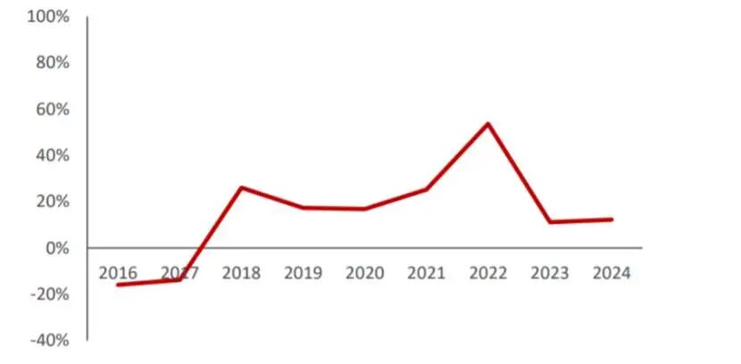 从2018年开始,中国化工行业开始了一轮轰轰烈烈的产能大扩张。从在建工程投资总额看,2018年到2024年年均保持正增长。2024年更是达到了3884亿元,同比增长12.3%,但比2022年的50%以上要慢一些了。2025年一季度则自2018年以来首次落入了负数区间。