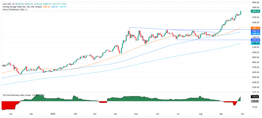 FXStreet分析师Christian Borjon Valencia指出,随着美国政府关门引发避险需求,金价飙升至3830美元/盎司附近。