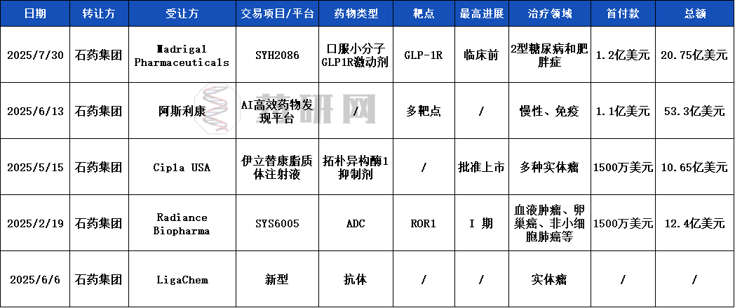 如果提及出海,石药集团今年以来的表现可谓是气势如虹,通过"产品+平台"双线出海战略,累计完成五项授权合作,总金额超97亿美元,展现出多元化全球布局。石药的出海项目覆盖多样,既包括GLP-1口服小分子、ADC等热门靶点与技术,也涵盖AI药物发现平台,适应症拓展至代谢疾病、肿瘤和慢性病等重要领域。其交易结构凸显高价值特征,如STH2086项目首付款达1.2亿美元,AI平台合作总金额逾53亿美元,充分获得国际市场的认可。