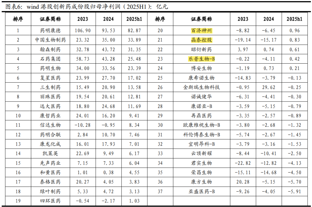 从2025年上半年归母净利润表现来看,港股创新药企业呈现出明显的分化格局。