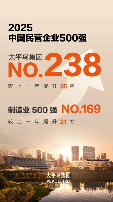 近日,“中国民营企业500强”榜单正式发布。太平鸟集团凭借卓越的综合实力,在榜单中排名大幅提升至第238位,较上一年跃升35名;同时,在本年度制造业500强榜单中,太平鸟集团排名也升至第169位,较上一年提升了21名。排名的双提升,不仅彰显了太平鸟在激烈的服装市场竞争中强劲的发展势头,更凸显了其作为时尚服饰领军品牌在行业内的卓越地位。