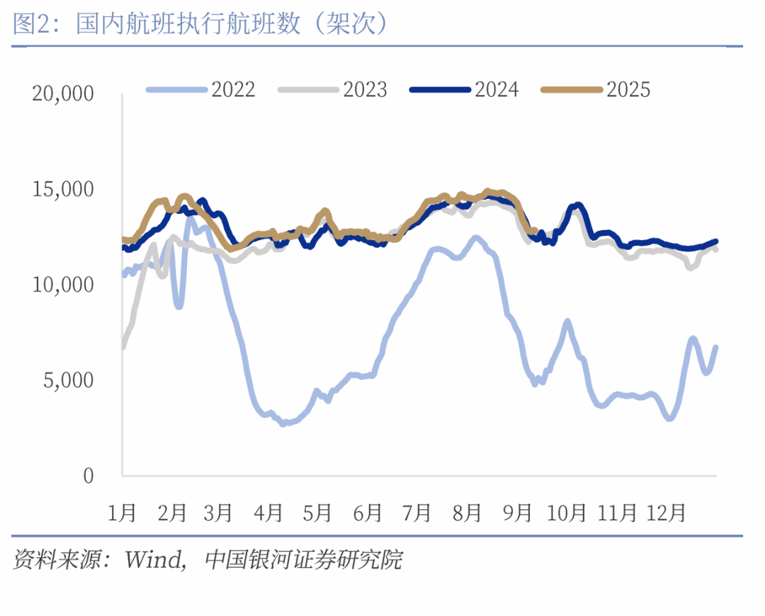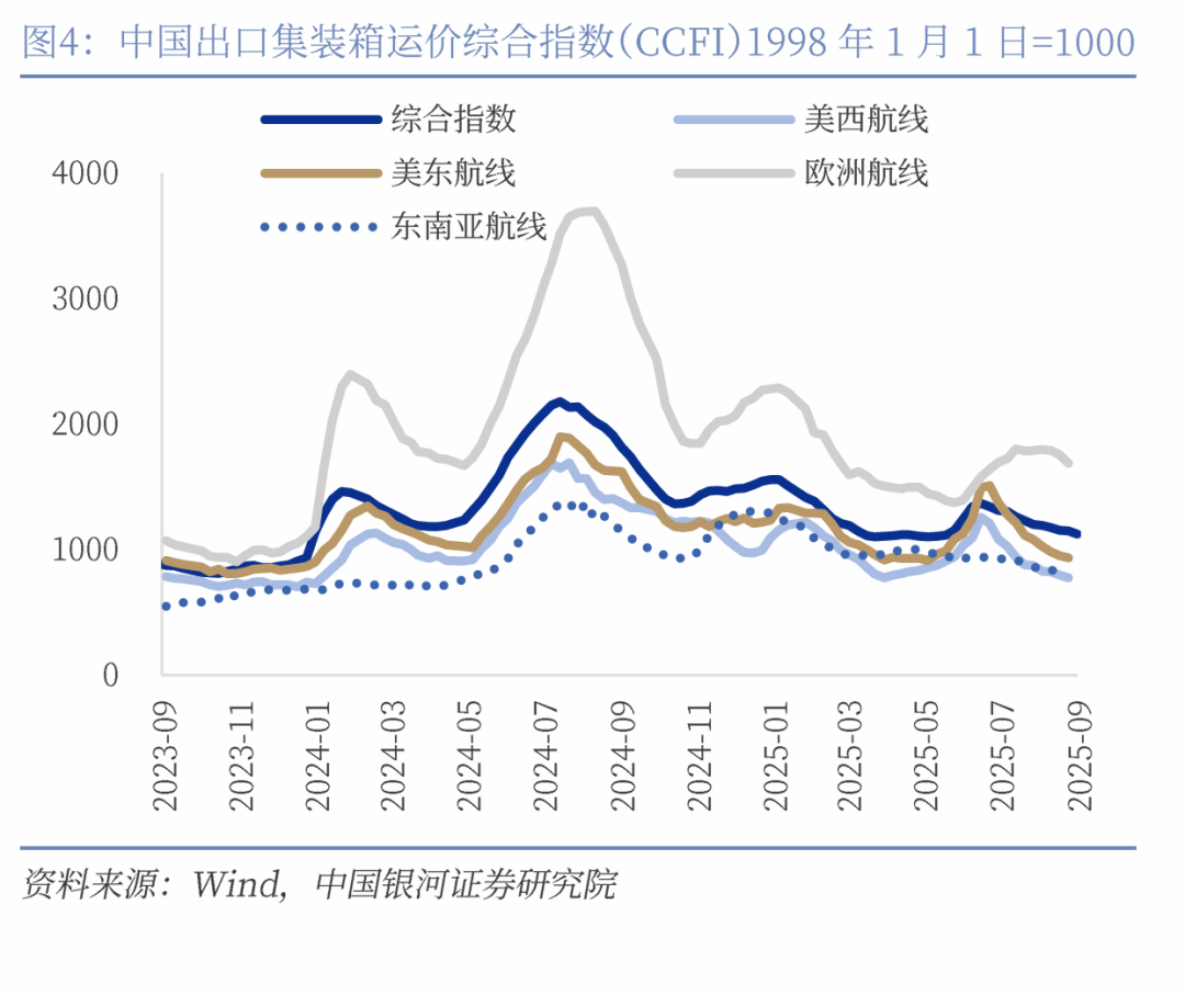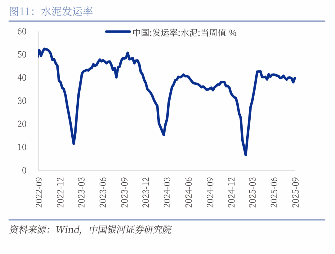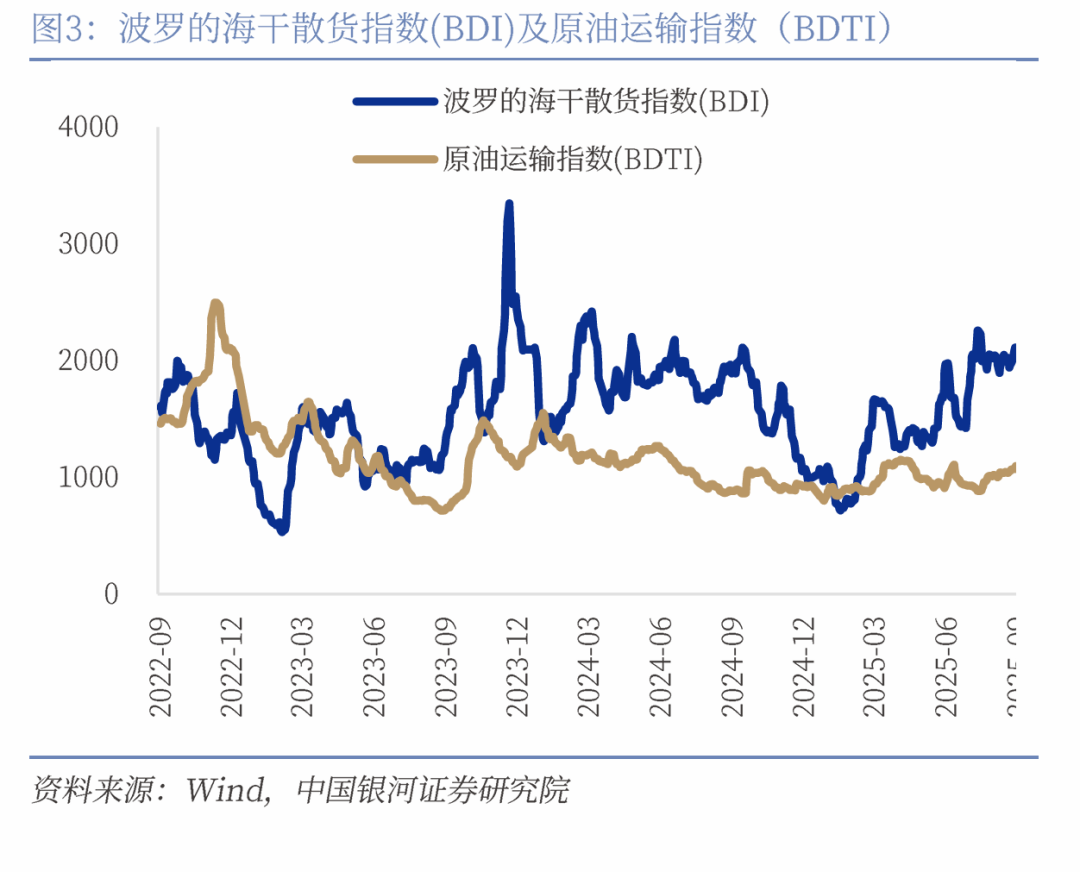 国内宏观-需求端:(1)消费:居民出行热度保持平稳,半径有所缩窄。截至9月12日,9月地铁客运量增速同比3.7%、环比-3.2%,国内执行航班数平均值为1.28万架次,环比-12.6%、同比-0.01%,随着暑期假日结束本周航班出行继续降温。据乘联会,9月首周全国乘用车市场零售30.4万辆,同比增长-10.3%,环比增长-3.8%。(2)外需:高频数据显示出口面临结构性压力,但区域转口贸易仍具韧性。截至9月12日,波罗的海干散货指数(BDI)均值为2023.7,环比1.12%,同比增长2.84%;中国出口集装箱运价指数均值为1137.2,较8月均值下降4.6%,同比下降36.0%。9月首周港口货物吞吐量25953.5万吨,同比增长7.2%,集装箱吞吐量664.6万箱,同比增长13.4%。