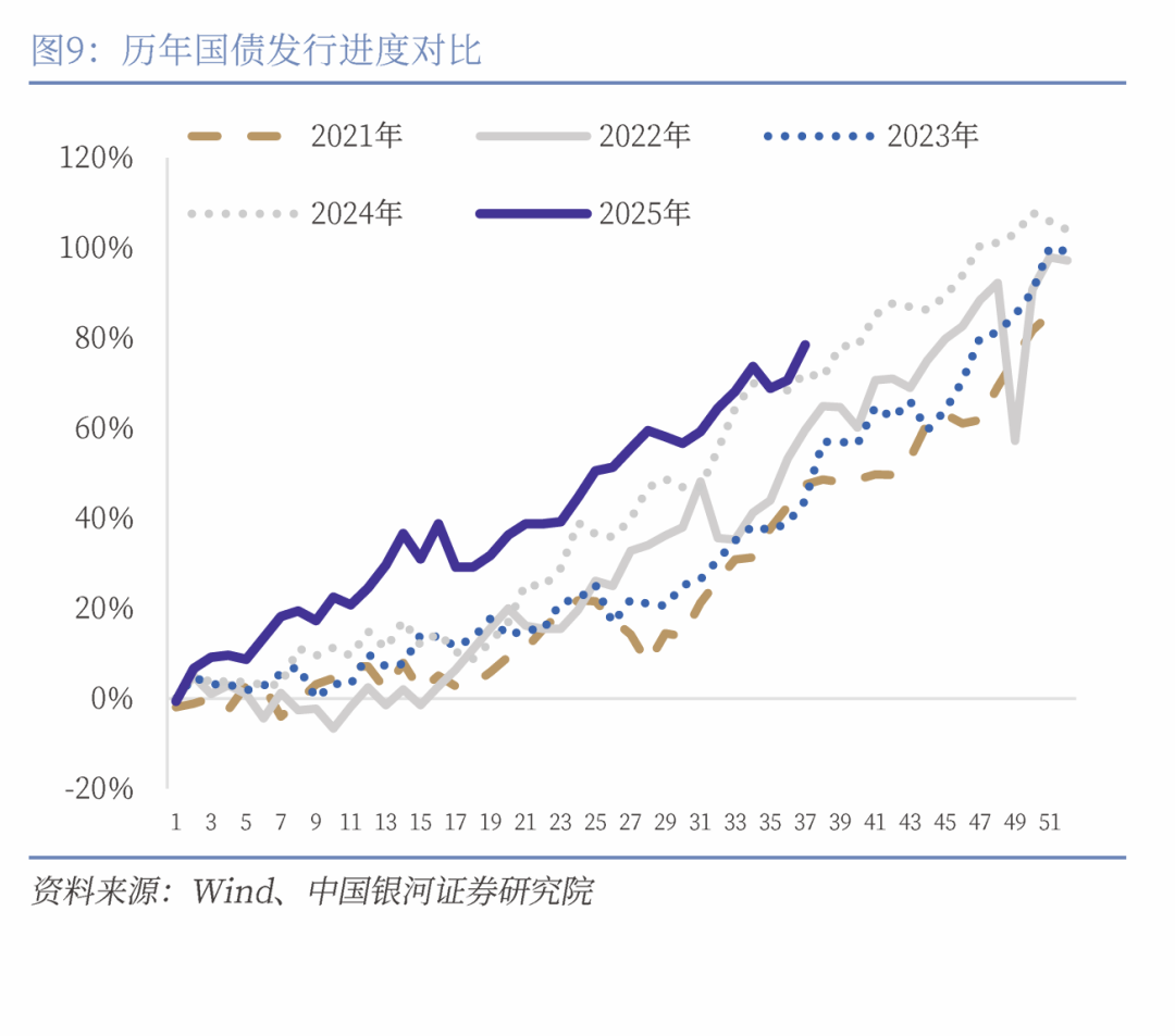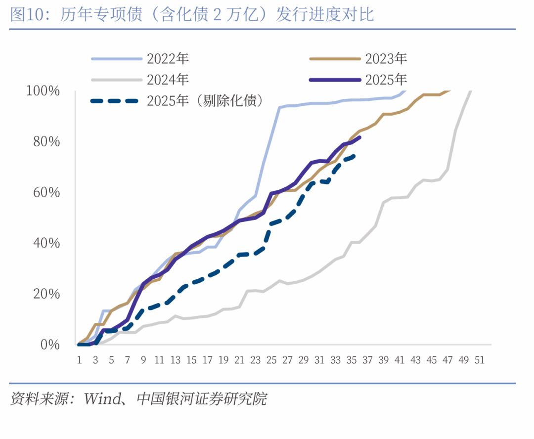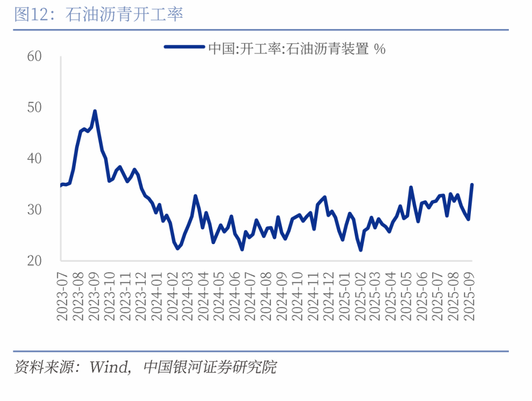 国内宏观-财政:本周国债、地方债发行提速。本周新增特别国债262亿、普通国债5,576亿,发行进度达78.5%,普通国债本周大幅提速。新增地方政府一般债1,217亿,发行进度77.8%;新增地方政府专项债2,061亿,专项债(不含化债)发行进度76.0%。目前央行流动性充裕,预计年内将在稳投资、促消费等方面实施更加积极的财政政策。投资方面:从本周高频数据来看,石油沥青开工率大幅回升,水泥发运率和石油沥青开工率均较去年有所提高,螺纹钢价格、高线价格延续下滑趋势。从投向来看,水泥主要用于水利、公共设施等项目建设,而石油沥青主要用于地方道路建设,螺纹和高线主要对应房建和制造业。总体来看本周基建需求有一定释放,但在地产低迷下整体大宗价格仍承压。
